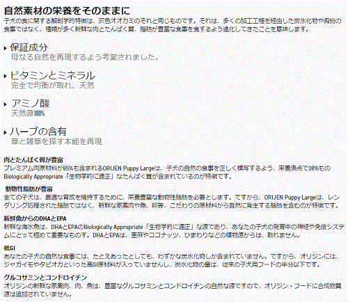 高たんぱくで低カロリーなオリジン・パピーラージは放し飼い鶏肉や七面鳥、自然の海で漁獲された魚、巣に産み落とされた卵など新鮮食材を使用しており、子犬が本来必要とする良質なたんぱく質と脂肪を豊富に含んでいます。