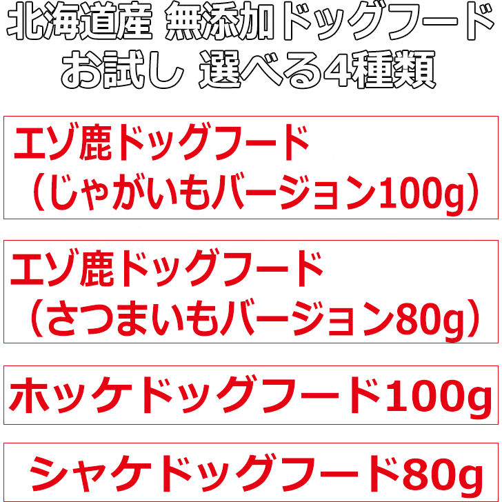 【選べる お試し 4点セット 北海道産無添加ドッグフード4種 】【エゾ鹿無添加ドッグフード ジャガイモバージョン サツマイモバージョン ホッケドッグフード シャケドッグフード】 ペットフード 国産 手作り 安心安全 老犬 穀物不使用 サンプル 日本製 送料無料 鮭